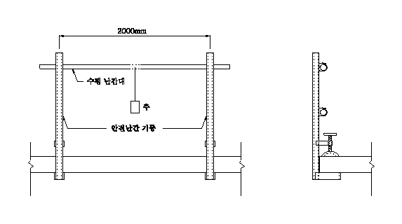 마. 수평 난간대의 강도시험은 그림 6과 같이 2개의 안전난간 기둥을 2,000㎜의 수평 간격으로 설치하고 상부 수평 난간대 중앙부에 120kg 추를 매달아 수평 난간대의 처짐량을 구하고, 160㎏의 추를 매달아 파괴유무를 조사한다. 다만, 꽂이용 안전난간 기둥은 제조자가 제출한 기둥재를 꽂을 수 있는 시험용 지그를 이용하여 시험한다. 이 경우 매다는 추에는 충격이 가해지지 않도록 해야 하며 고정볼트의 조임은 표 4의 값을 표준으로 한다.