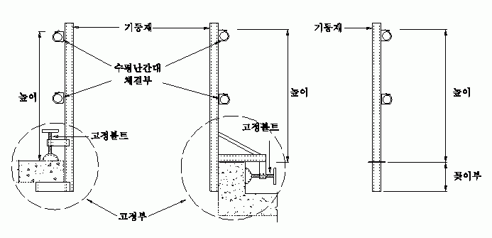 가. 안전난간은 그림 1과 같이 기둥재, 기둥을 구조물에 고정하기 위한 고정부, 수평 난간대 체결부 등이 있는 안전난간 기둥과 수평난간대로 구성된 구조이어야 한다. 다만, 꽂이용 안전난간 기둥은 고정부를 생략하는 대신 고정되는 부위에서 핀 또는 볼트 등을 이용하여 이탈되지 않는 구조이어야 한다.