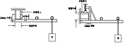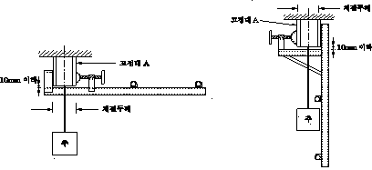 라. 고정부 미끄러짐 시험은 그림 5와 같이 체결두께가 최소인 경우에 대하여 고정대 A와 안전난간 기둥 사이의 간격이 10㎜ 이내가 되도록 안전난간 간격을 고정시킨 후, 고정부의 체결두께 중심선상에 85㎏의 추를 매달아 고정부의 미끄러짐을 조사한다. 다만, 꽂이용 안전난간 기둥은 고정부 미끄러짐 시험을 하지 않는다. 이 경우 매다는 추에는 충격이 가해지지 않도록 해야 하며 고정볼트의 조임은 표 4의 값을 표준으로 한다.