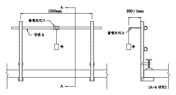 다. 수평 난간대 체결부의 회전방지 성능시험은 그림 4와 같이 2개의 안전난간 기둥을 1,500㎜ 간격으로 설치하고 상부 수평 난간대 체결부에 적합한 강관 A를 연결한 후 그 중앙에 클램프 지그를 고정한 다음 클램프 지그 끝에 추를 매달아 회전유무를 조사한다. 이 경우 매다는 추에는 충격이 가해지지 않도록 해야 하며 추의 질량(P)은 다음의 산식에 의하여 계산된 값으로 한다. P = 0.3×D㎏