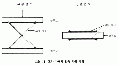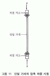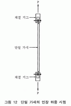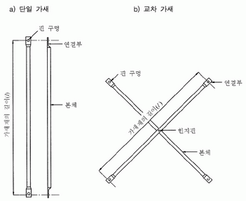 4.2.3 가새재는 그림 4와 같이 본체와 연결부가 일체화된 구조이어야 한다. a) 가새재는 형태에 따라 단일 가새와 2개의 가새재가 가새재 중앙의 힌지핀에 의해 일체화된 교차 가새로 구분된다. b) 가새재의 길이는 2 700 mm 이하이어야 하며, 길이의 치수 허용차는 규정된 길이의 ±1.0mm로 한다. c) 가새재로 사용하는 강재는 표 4의 규정에 적합하거나 이와 동등 이상의 단면 성능을 가진 것을 사용하여야 한다. d) 연결부는 주틀의 가새 연결핀에 결합되기 위한 핀 구멍이 있어야 하며, 결합된 뒤에는 이탈되지 않는 구조이어야 한다.