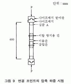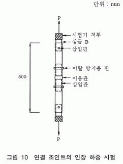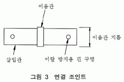 4.2.2 연결 조인트는 그림 3과 같이 이음관과 삽입관으로 구성되며, 다음 각 호의 규정에 적합하여야 한다. a) 이음관은 주틀의 수직재가 밀착될 수 있는 구조이어야 한다. b) 이음관의 길이는 25 mm 이상이어야 하며, 지름은 수직재의 바깥지름과 동일하여야 한다. c) 삽입관의 길이는 100 mm 이상이어야 하며, 바깥지름은 48.6±0.25 mm, 두께는 2.5±0.3 mm이어야 한다. d) 삽입관의 양단부에는 지름 13.0±0.2 mm의 이탈 방지용 핀 구멍이 있어야 하며, 삽입관의 단부에서 핀 구멍까지의 순 간격은 20 mm 이상이어야 한다. e) 이탈 방지용 핀의 길이는 100 mm 이상, 지름은 12.0±0.4 mm이어야 하며, 이탈 방지용 핀의 끝은 결함이 없어야 한다.