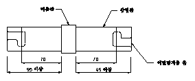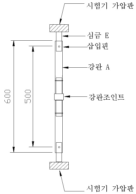나. 강관조인트의 변위 및 인장시험은 그림 8과 같이 심금 E, 삽입핀 및 강관 A를 사용하여 이탈방지 기능을 작동한 상태의 강관조인트를 시험기에 부착시킨 후 인장력을 가하여 하중이 9,000 N일 때에 변위측정기를 이용하여 강관조인트의 변위량을 측정하고 계속 인장력을 가하여 인장하중의 최대값을 측정한다. (이 경우, 재하 속도는 분당 8㎜ 이하로 한다)