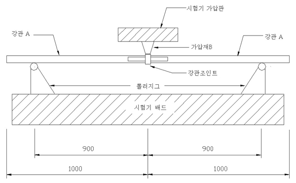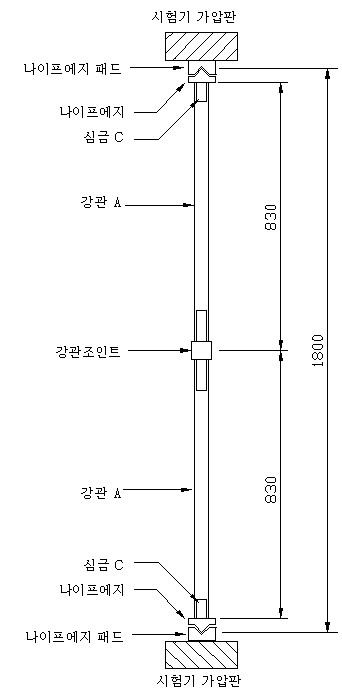 다. 강관조인트의 압축시험은 그림 9와 같이 심금 C, 나이프에지 및 나이프에지 패드와 강관 A를 사용하여 이탈방지 기능을 작동한 상태의 강관조인트를 상·하의 가압판 중심에 일치시킨 후 시험기 가압판으로 압축하여 하중의 최대값을 측정한다. (이 경우, 재하 속도는 분당 8㎜ 이하로 한다)
