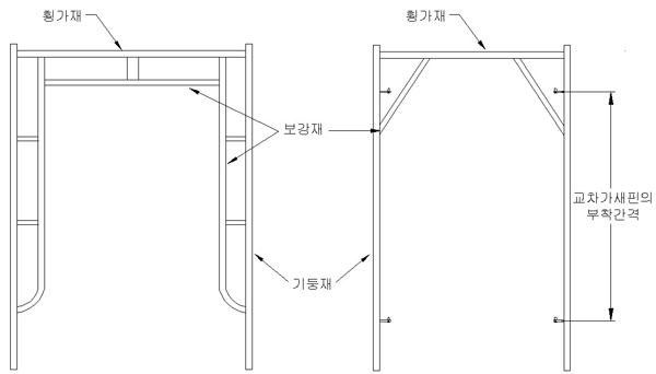 가. 주틀은 그림 2와 같이 기둥재, 횡가재, 보강재 및 교차가새 핀이 용접 등에 의해 일체화된 구조이어야 하며 다음 각 세목과 같이 한다.