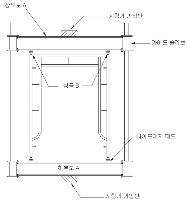 가. 주틀의 압축시험은 그림 11과 같이 상부보 A와 하부보 A, 가이드슬리브와 가이드 파이프, 심금 B 및 나이프에지와 나이프에지 패드를 사용하여 시험기 상·하의 가압판 중심에 상부보 A 및 하부보 A의 중심을 일치시킨 상태에서 주틀을 시험기에 부착하고 주틀의 중심선상에 압축하중을 가하여 하중의 최대값을 측정한다. (이 경우 나이프에지의 방향은 횡가재 방향과 평행하게 부착되어야 하며 재하 속도는 분당 8㎜ 이하이고 상부보 A 및 하부보 A, 가이드 슬리브 및 가이드 파이프, 심금 B, 나이프에지 및 나이프에지 패드는 각각 별표 24 제1호부터 제4호까지의 규정에 따른다)