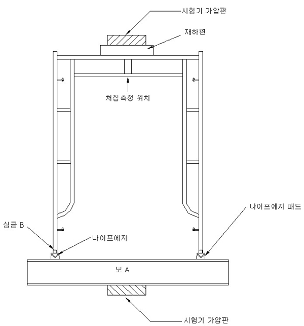 나. 주틀의 수직처짐시험은 그림 12와 같이 심금 B, 나이프에지와 나이프에지 패드, 보 A, 재하편 및 처짐측정기를 사용하여 시험기의 하부 가압판 중심에 보의 중심을 일치시킨 상태에서 주틀을 시험기에 부착하고 주틀의 중심선상에 압축하중을 가하여 하중이 10,000N일 때 횡가재 중앙부의 수직처짐량을 측정한다. (이 경우 나이프에지의 방향은 횡가재 방향과 수직하게 부착되어야 하며 재하 속도는 분당 8㎜ 이하이고, 심금 B, 나이프에지 및 나이프에지 패드, 보 A, 재하편은 각각 별표 24 제3호부터 제6호까지의 규정에 따른다)