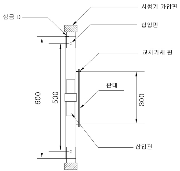 다. 주틀의 교차가새 핀 시험은 그림 13과 같이 심금 D, 삽입관, 판대 및 삽입핀을 사용하여 주틀 기둥재의 하단부에 있는 교차가새 핀의 부분 2개(동일한 주틀로부터 잘라낸 것에 한한다)를 한조로 하여 시험기에 부착하고, 인장력을 가하여 하중의 최대값을 측정 한다.(이 경우 재하 속도는 분당 8㎜ 이하로 하고, D, 삽입관, 판대 및 삽입핀은 각각 별표 24 제3호 및 제7호부터 제9호까지의 규정에 따른다)