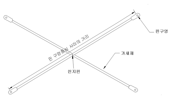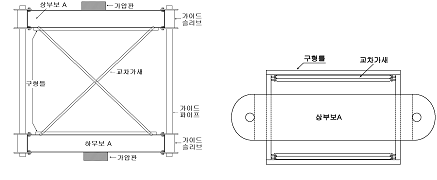 교차가새의 압축시험은 그림 14와 같이 상부보 A, 하부보 A, 가이드슬리브 및 가이드 파이프와 구형틀을 사용하여 시험기의 상·하 가압판 중심에 상부보 A 및 하부보 A와 구형틀의 중심을 일치시킨 상태에서 교차가새 2개를 한조로 하여 시험기에 부착하고 압축하중을 가하여 하중의 최대값을 측정한다. (이 경우, 교차가새 핀의 이탈방지기능을 작동시킨 상태에서 재하 속도는 분당 8㎜ 이하이고, 상부보 A 및 하부보 A, 가이드 슬리브 및 가이드 파이프와 구형틀은 각각 별표 24 제1호, 제2호 및 제10호의 규정에 따른다)
