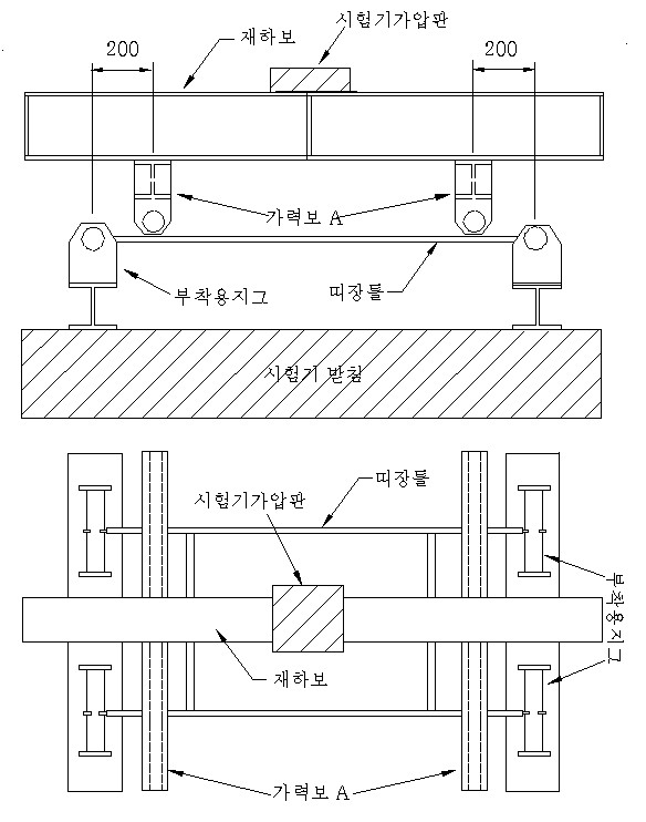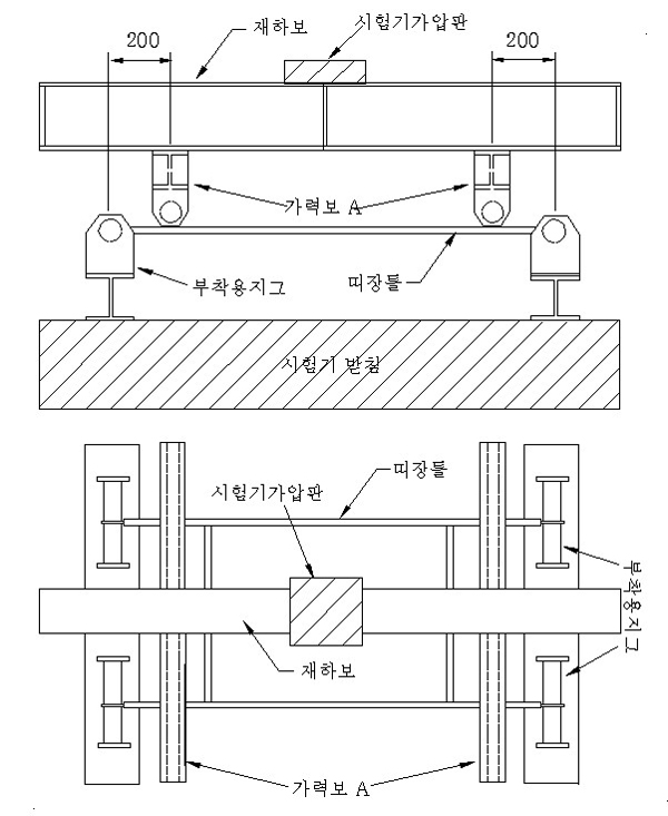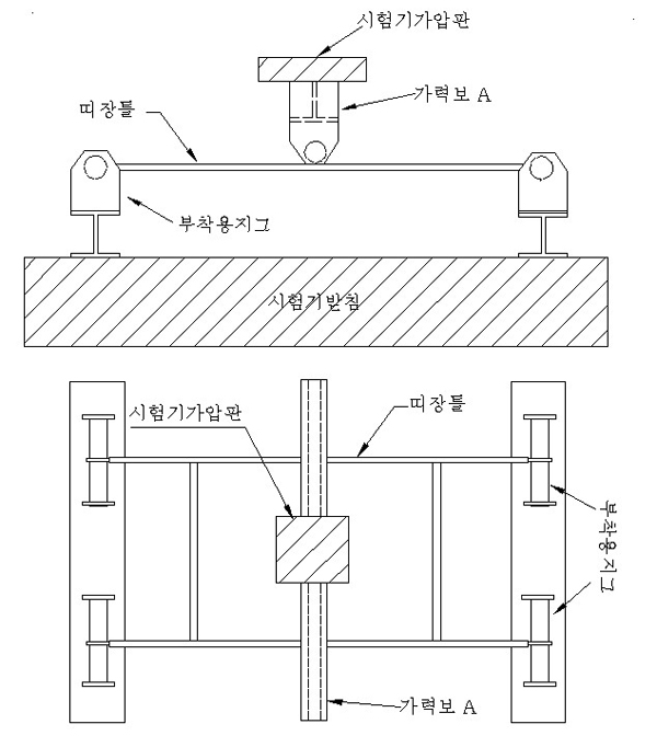 나. 걸침고리의 본체 및 부착부의 전단시험은 그림 16과 같이 가력보 A, 재하보 및 부착용 지그를 사용하여 띠장틀을 시험기에 부착하고 재하보의 중앙부에 하중을 가하여 하중의 최대값을 측정한다.(이 경우, 재하 속도는 분당 8㎜ 이하로 한다)