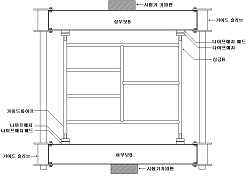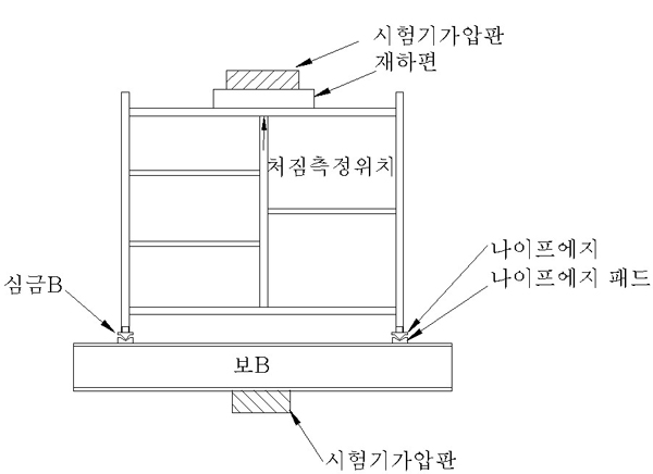 나. 주틀의 처짐시험은 그림 5와 같이 심금 B, 나이프에지와 나이프에지 패드, 보 B, 재하편, 처짐측정기를 사용하여 시험기의 하부 가압판 중심에 보의 중심을 일치시킨 상태에서 주틀을 시험기에 부착하고 주틀의 중심을 시험기 가압판으로 가력하여 하중이 7,500N일 때 상부횡가재 중심의 수직처짐량을 측정한다.(이 경우, 나이프에지의 방향은 횡가재 방향과 수직하게 부착되어야 하며 재하 속도는 분당 8㎜ 이하로 한다)