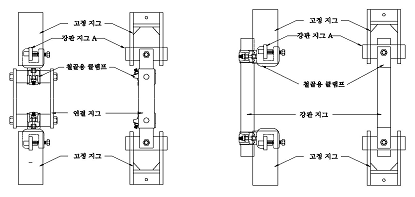 가. 철골용 클램프 부착부의 미끄러짐 시험은 종류에 따라 직교형은 그림 7의 가)와 같이 고정지그, 강판지그 A 및 연결지그를 평행형은 그림 7의 나)와 같이 고정지그, 강판지그 A 및 강관지그를 사용하여 각각 2개의 철골용 클램프 한조를 시험기에 설치하고 인장 하중을 가하여 부착부가 미끄러졌을 때 하중의 최대값을 측정하고 겸용형은 직교형 및 평행형의 사용 조건에 따라 최대 하중을 측정한다.(이 경우, 부착부 및 긴결부의 볼트 조임은 45,000N·㎜로 하고 재하 속도는 분당 8㎜ 이하로 한다)