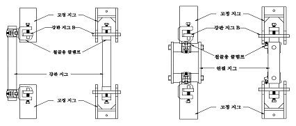 나. 철골용 클램프 부착부의 인장시험은 종류에 따라 직교형은 그림 8의 가)와 같이 고정지그, 강판지그 B 및 강관지그를 평행형은 그림 8의 나)와 같이 고정지그, 강판지그 B 및 연결지그를 사용하여 각각 2개의 철골용 클램프 한조를 시험기에 설치하고 인장하중을 가하여 하중의 최대값을 측정하며 겸용형은 직교형 및 평행형의 사용 조건에 따라 최대 하중을 측정한다.(이 경우, 부착부 및 긴결부의 볼트 조임은 45,000N·㎜로 하고 재하 속도는 분당 8㎜ 이하로 한다)